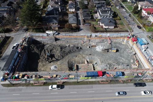 Matcon successfully executed bulk excavation and shoring for a residential tower in Burnaby, with unique challenges posed by its adjacency to the Millennium Line Skytrain.